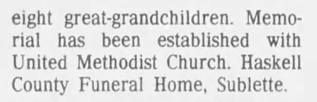 Memorials are suggested to the Happy Agers Site of Satanta and may be left at the Shopping Stop True Value in Satanta or mailed to Haskell County Funeral Home, Box 607, Sublette, KS 67877